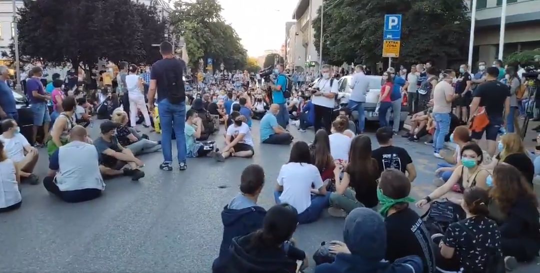 Протест протиче мирно, окупљени грађани свирају у пиштаљке и трубе и повремено певају.