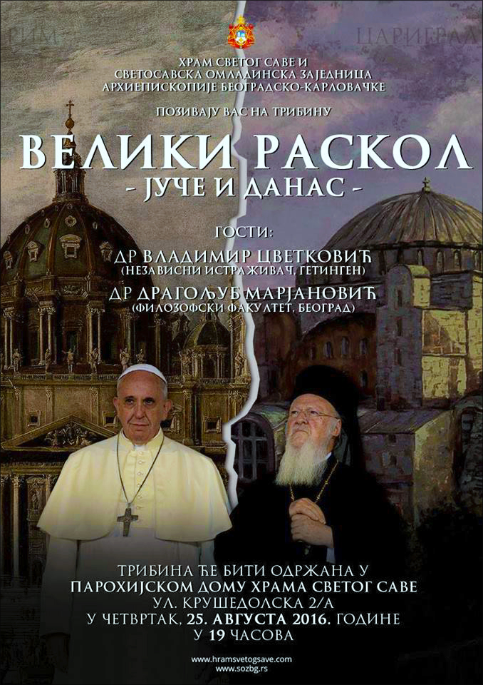 ХРАМ Светог Саве на Врачару и Светосавска омладинска заједница Архиепископије београдско-карловачке организују 25 августа трибину „Велики раскол - јуче и данас“.