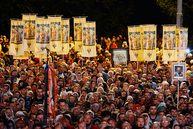 НА СТОТУ годишњицу од стрељања царске породице, Његова Светост Патријарх московски и целе Русије Кирил служио је Свету литургију на дрвеном подијуму испред спомен-храма у Јекатеринбургу.