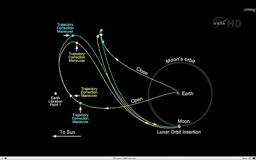 Иначе, прва од сонда треба да `ухвати` орбиту око Месеца – на којој ће потом остати пуних 80 дана – 31. децембра у 16,21 по времену Источне обале САД, а друга – у 17,05 1. јануара 2012. године.