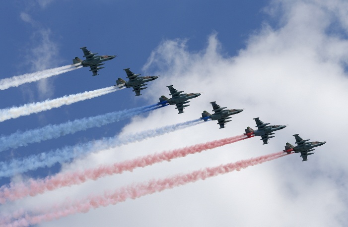 Последњи су пролетели јуришни авиони Су-25 који су - по традицији - на небу оставили боје руске државне заставе.