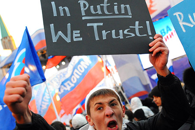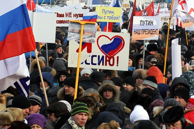 МИТИНГ присталица Владимира Путина - на Поклоној Гори, који је окупио 130-140 хиљада људи, иако су организатори полицији најавили „до 15.000“ - протекао је мирно, али у борбеном духу и под паролама: „Да - јединству Русије и Владимиру Путину, не - обојеној чуми која би да растури нашу земљу!“
