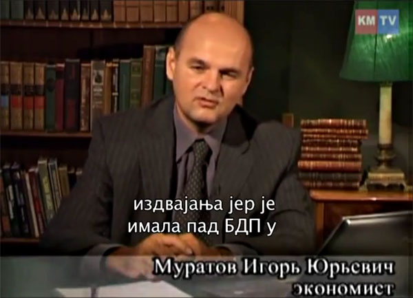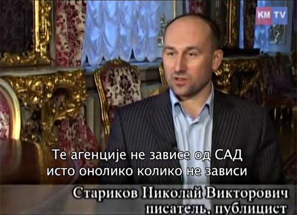 * Николај Викторович СТАРИКОВ, писац и публициста: У свету постоје само три рејтинг агенције: Фич, Модис и још једна са тешко изговорљивим називом. Те агенције не зависе од САД исто онолико колико не зависи армија САД јер представљају један од најважнијих инструмената за очување доминације Англосаксонаца на светском финансијском тржишту. Сада је на делу криза читавог економског система која је настајала током протеклих 30 година