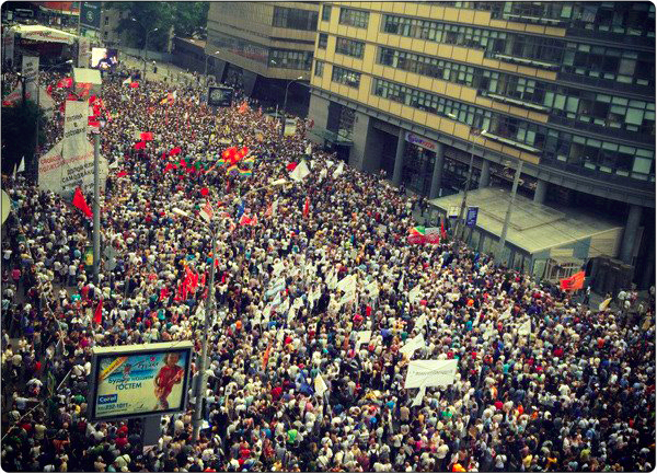 - Колоне демонстраната су се шарениле од разних застава: комунистичких црвених, зелених, партије Јаблоко и монархистичких црно-жутих. На митингу говорили сви главни лидери опозиције