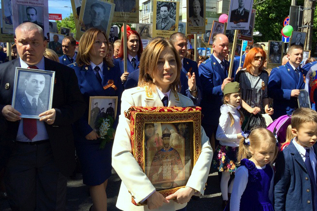 Поклонска на челу „Бесмртног пука“ у Симферопољу са иконом цара Николаја II
