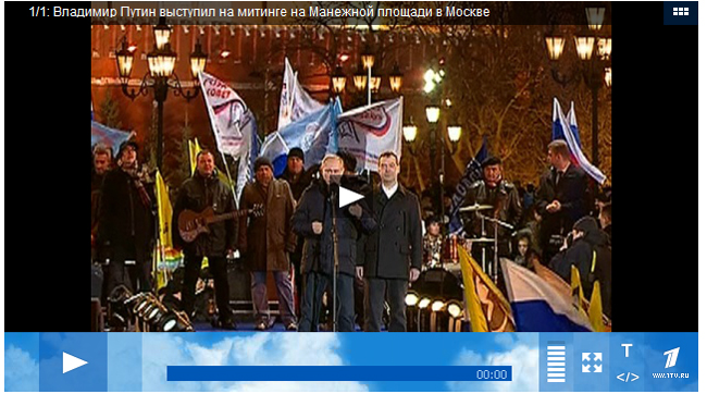 „Драги пријатељи! Желим да се захвалим свим грађанима Русије који су учествовали на изборима председника Руске Федерације. Посебно се захваљујем свима који сте се окупили овде у Москви и свима који који нас подржавају у сваком углу наше огромне, непрегледне Отаџбине. Хвала свима који су рекли „да!“ великој Русији!