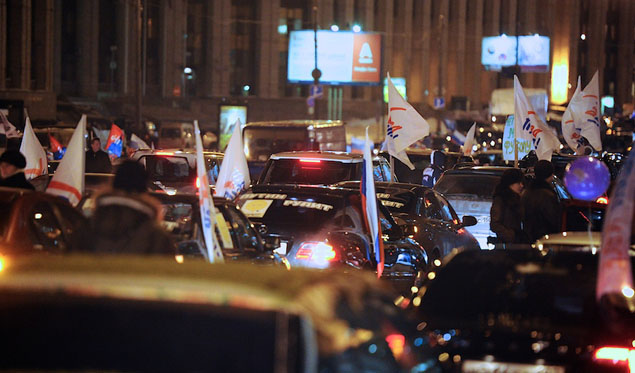 На неким возилима је на задњем стаклу могао се видети натпис «Путин волани». Неколико аутомобила је прошло спољном страном Садовог каљца са заставама и симболима Јединствене Русије.