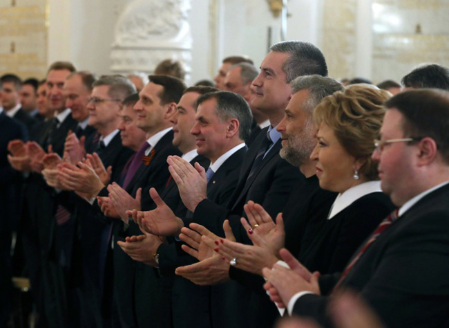 „Добар дан, уважени чланови Савета Федерације, уважени посланици Државне Думе! Уважени представници Републике Крим и Севастопоља - они су овде, међу нама, грађани Русије, становници Крима и Севастопоља! (аплауз)