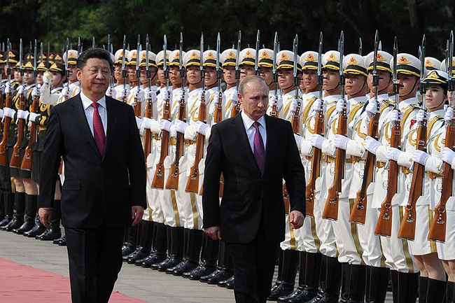 Његов домаћин - кинески лидер Си Ђинпинг - нагласио је да се Пекинг и Москва залажу за политичко решавање међународних проблема и да су против примене силе и санкција: