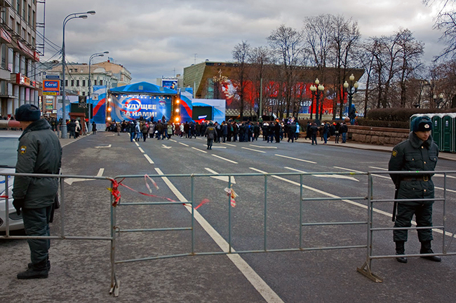 У понедељак 5. марта, дан после председничких избора на којима је победио премијер Владимир Путин, у Москви је одржан читав низ акција подршке властима. Одобрена протестна акција опозиције на Пушкиновом тргу претворила се у неодобрени митинг. Полиција је одреаговала привођењем око 250 људи.