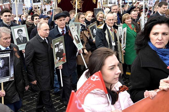 Међу њима је и ове године био шеф државе Владимир Путин. Он је опет носио портрет свог оца Владимира Спиридоновича Путина који је ратовао иако није морао и био тешко рањен бранећи Лењинград.