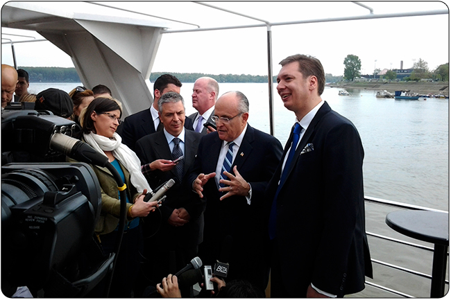 „Докле год се дуго чека на дозволе, биће више корупције, а мање инвестиција, изградње и радних места. Корупција мора бити нападнута с врха. Зато је веома важан Вучићев план увођења Канцеларије за брзе одговоре и смањење бирократије, што сам и ја својевремено урадио у Њујорку. И сам сам 80-их година имао сличне проблеме као Вучић данас, нико није веровао да Њујорк, који је такође град на води, може да се подигне и да се у њему успостави ред. А показао сам свима да може. Драго ми је што Вучић има тако крупне идеје попут пројекта „Град на води“ и срећан сам што видим да оно што сам ја урадио са обновом Тајмс сквера у Њујорку, Вучић планира да уради у Београду“, поручио је Рудолф Ђулијани.