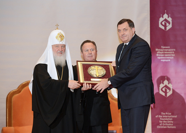 Патријарх Кирил је признање предсједнику Српске уручио на свечаности која је одржана у сали црквених савета Храма Христа Спаситеља у Москви.