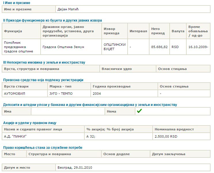 Први извештај о имовини (и њега достављамо у прилогу), Матић је поднео 29. јануара 2010. као помоћник председника општине Земун и тада је од имовине имао само аутомобил „југо 45 темпо“ из 2004. и 32 акције Акционарског друштва „Пинки Земун“, власника истоимене спортске хале. И то је било све што је Матић пријавио.