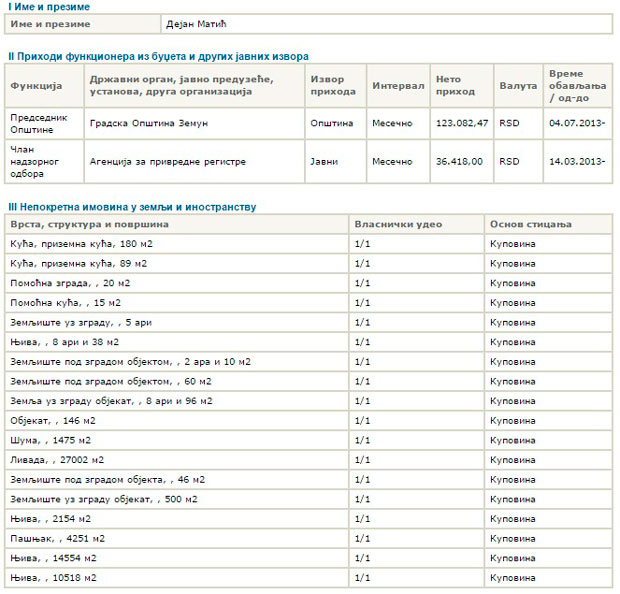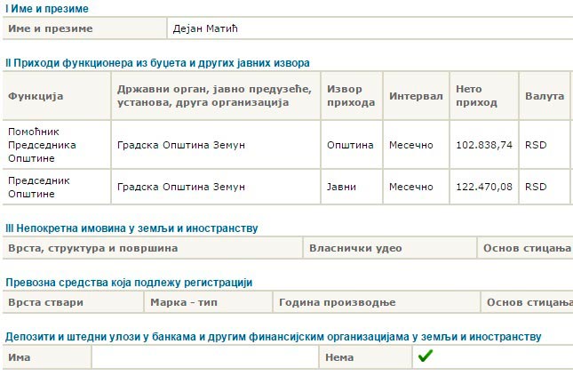 У претходној карти, поднетој 6. августа 2013. (коју такође достављамо), непосредно након што је изабран за председника општине Земун, Матић није имао чак ни штедне депозите у банкама. Дакле, ништа од имовине.