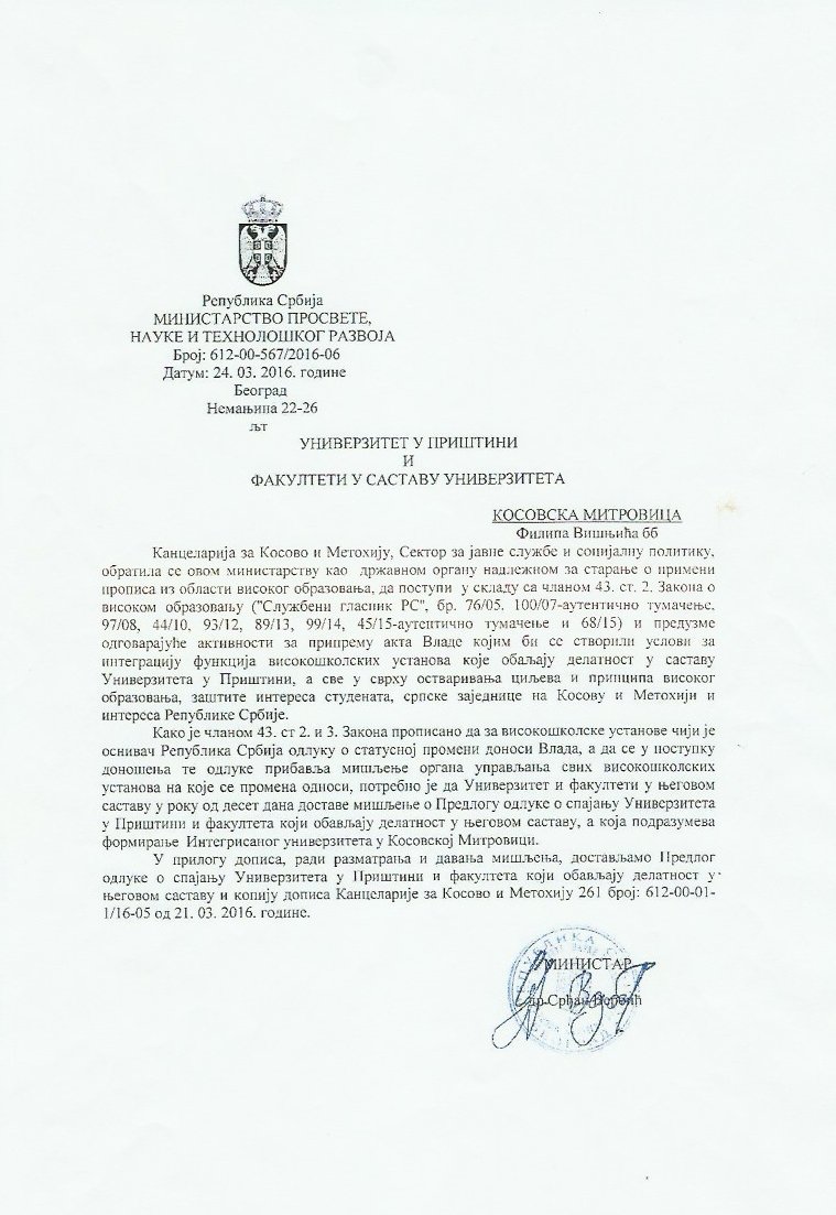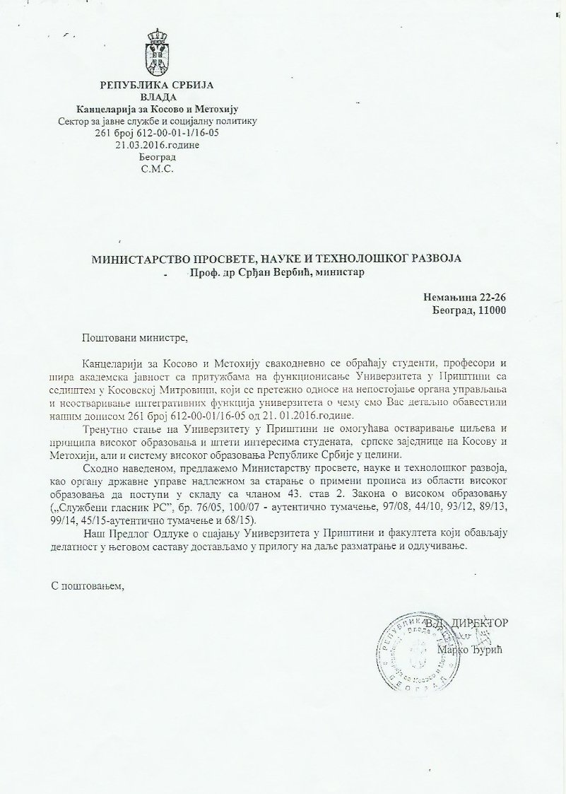 За потребе истине и јавног мњења, а у циљу разоткривања намере директора Канцеларије за КиМ за променом статуса и гашењем Универзитета у Приштини, у прилог достављамо документ којим се лично господин Ђурић обратио ресорном министарству задуженом за високо школство, са конкретним захтевом, наравно, уредно потписаним и печатираним: