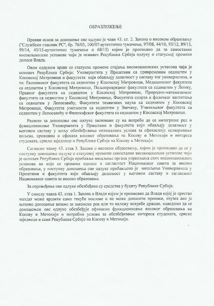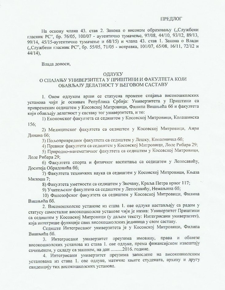 - Сви факултети Приштинског Универзитета су се 28. марта 2016. изјашњавали поводом предлога Канцеларије за КиМ. Од десет факултета - њих девет се изјаснило против, док је један био уздржан. На основу тог изјашњавања - Сенат и Савет Универзитета су једногласно одбацили предлог Канцеларије за КиМ