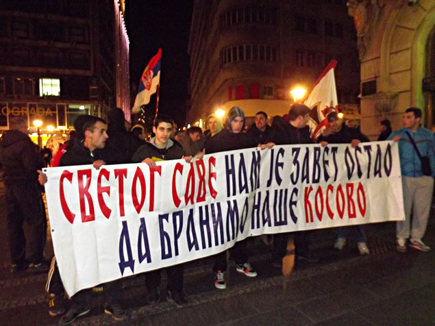 * Окупљени су тада кренули ка Теразијама и Филозофском факултету носећи транспарент "Од Св. Саве нам је завет остао да бранимо наше Косово" и скандирајући "Тадићу, Усташо", "Тадићу, одлази" и "Косово је Србија"