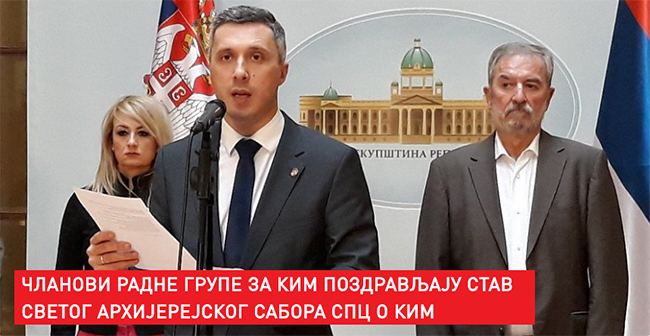 Подсећамо да се Радна група за КиМ обраћала Српској православној цркви са молбом и мишљењем да је у овом тренутку став Цркве по питању Косова и Метохије пресудан да се спречи потписивање правно-обавезујућег споразума са лажном државом Косово, што практично значи признање тзв. независног Косова. СПЦ је национална институција у коју српски народ има највеће поверење и зато нас ова Порука са заседања Светог архијерејског сабора радује. Ако је било ко у српском државном врху имао идеју да потпише правно-обавезујући споразум и тзв. независном Косову омогући столицу у УН - надамо се да се после ове поруке СПЦ неће усудити на тако нешто“.