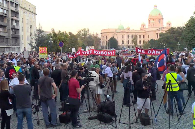Представник Иницијативе Радомир Лазовић је испред Скупштине града указао на то да су се организатори протеста током преходних месеци суочавали са разним притисцима и нападима у медијима, у чему су како је навео, предњачили Информер, Српски телеграф и телевизије Пинк и Студио Б.