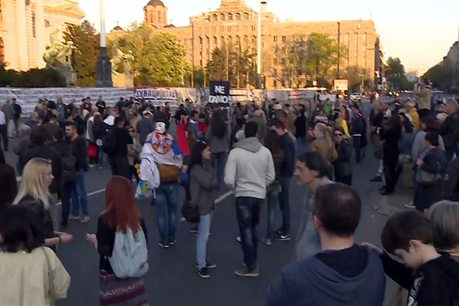Учесници протеста дувају у пиштаљке и носе транспаренте „Против терора власти“, „Вучић демократа, ја диктатор“, „Не дамо“, „Бори се за боље сутра“.
