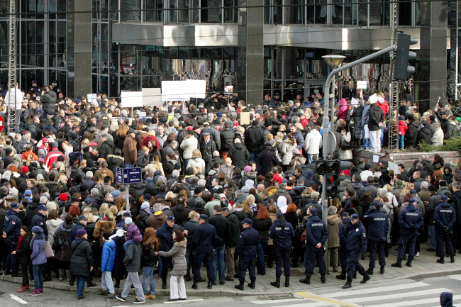 Грађани су скандирали „Уааа“, „Доле банке“, „Лопови“, „Нећемо да наша деца отплаћују наше кредите“ и позивали гувернера НБС Јоргованку Табаковић да им помогне и разговором са банкама понуди решење за проблеме настале јачањем швајцарског франка.