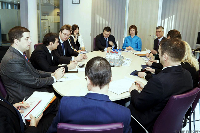 „Разговарала сам данас у Бриселу с премијером Дачићем, премијером Тачијем и њиховим делегацијама, у оквиру дијалога ради нормализације односа између Београда и Приштине“, навела је Ештон у саопштењу.