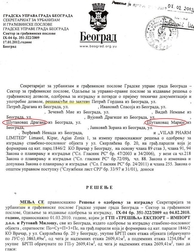 Као представник инвеститора пред надлежним градским органима појављивао се Драган Петрић, који је од Секретаријата за урбанизам и грађевинске послове града Београда 20. јула 2011. затражио издавање новог решења о одобрењу изградње, како се у самом захтеву наводи, „због промене инвеститора“. Градски секретар за урбанизам и грађевинске послове Милан Вуковић 17. јануара 2012. доноси ново решење којим је променио раније правоснажно решење о одобрењу изградње (IX-04 бр. 351-322/2009) од 4. 2. 2010. Првобитни инвеститори изградње били су ГТП Трешња експорт-импорт д.о.о. из Београда и Милош Рутовић, а њима је одобрена изградња 3.863,49 квадратних метара стамбено-пословног простора.