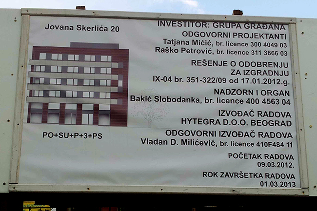 Упркос томе, на информативној табли која је уредно постављена на градилишту у Скерлићевој 20 наведени су сви подаци које налаже Закон о планирању и изградњи, осим оног најбитнијег - ко је инвеститор. На табли се загонетно наводи „група грађана“ и број решења о одобрењу за изградњу. Радове изводи фирма Hytegra д.о.о. и они су почели 9. марта ове године, са роком завршетка до 1.3.2013. На табли такође стоји да су одговорни пројектанти Татјана Мићић и Рашко Шетровић и надзорни орган Слободанка Бакић.