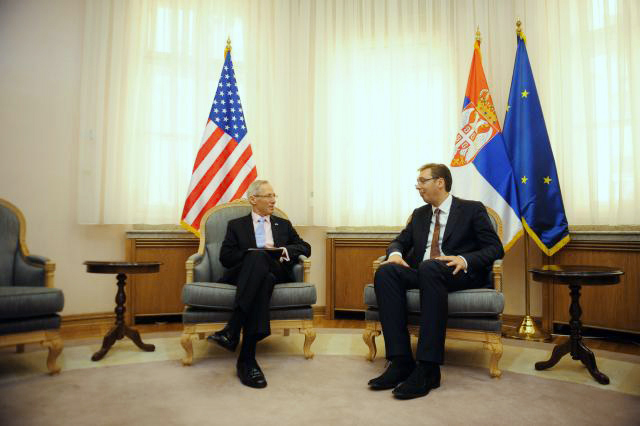 ПРЕМИЈЕР Србије Александар Вучић разговарао је у уторак у Влади Србије с амбасадором САД у Србији Мајклом Кирбијем о преговорима с америчком компанијом Есмарк о преузимању Железаре Смедерево, саопштила је Канцеларија Владе за сарадњу с медијима.
