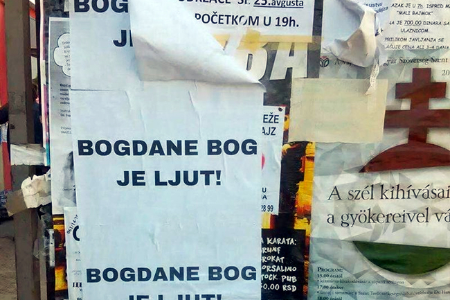 СРЕЛИ СЕ У ЈЕДНОМ СУБОТИЧКОМ КАФИЋУ ЗБОГ ПЛАКАТА „БОГДАНЕ, БОГ ЈЕ ЉУТ“ ИЗЛЕПЉЕНИХ ПО ГРАДУ