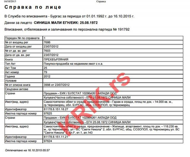 КРИК је из бугарског регистра данас узео оверену документацију за фирму „Биргам Холдинг &Финанце Инц” са Британских Девичанских Острва, која показује да се Синиша Мали и даље води као директор ове компаније. Између осталог, ту је и решење из 2014. године које је Синиша Мали потписао ка директор те офшор фирме.