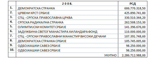Тих првих десет су: ДС, Црвени крст Србије, СПЦ, СРС, Олимпијски комитет Србије, Задужбина Светог манастира Хиландар и Високи Дечани, ДСС и Одбојкашки савез Србије. Детаљан преглед је у Табели2.