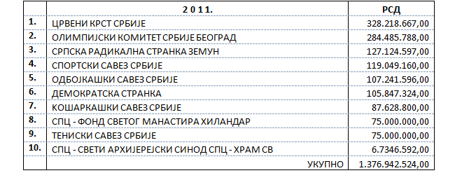 За 530 добитника прекомилионских донација у 2011. било је потрошено 4,56 милијарди динара. Те године је за цео НВО сектор издвојено 4,86 милијарди. Највише пара, укупно 1,3 милијарде добили су: Црвени крст Србије, Олимпијски комитет Србије Београд, СРС Земун, Спортски савез Србије, Одбојкашки савез Србије, ДС, Кошаркашки савез Србије, СПЦ- Фонд Светог манастира Хиландара и Тениски савез Србије. У Табели 5 су тачни износи уплата.