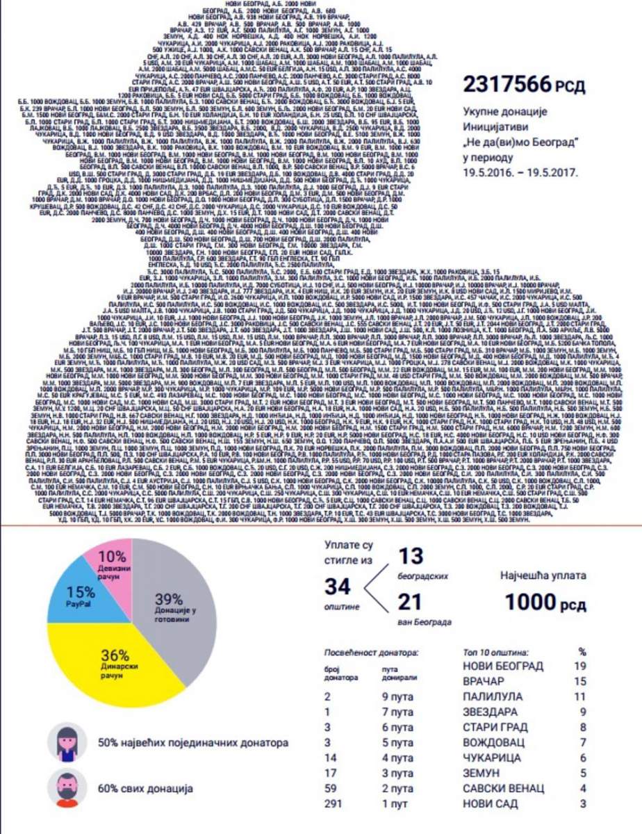 На инфографици су приказани анонимизовани подаци о свим уплатама преко рачуна, што је било око 60 одсто од укупних донација, док је остатак сакупљен у готовини, углавном на самим протестима, наведено је у саопштењу Иницијативе не да(ви)мо Београд.