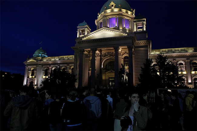 Окупљање младих који протестују због победе Александра Вучића на изборима за председника Србије, почело је око 18 сати испред Дома Народне Скупштине.