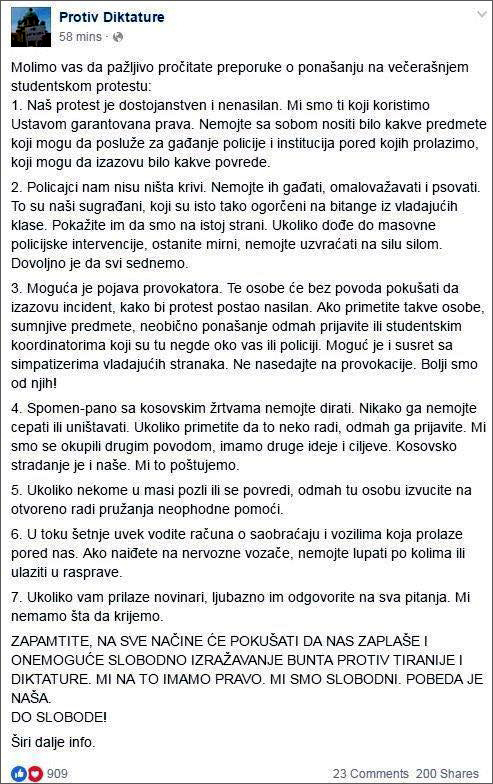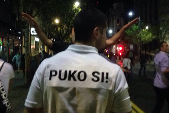 - У Београду окупљени носе налепнице „Пук'о си“ и „Против ненормалног“ и транспаренте међу којима су „Данас излазим на улицу да сутра не бих живео на њој“ и „У ћошак“
