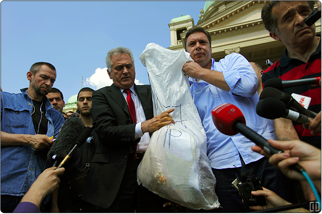 Руководећи двојац СНС је на конференцију за новинаре, уприличену испред Дома Народне скупштине, донео као „корпус деликти“ - врећу пуну гласачких листића пронађених у контејнеру поред једног бирачког места. Уз тврдњу: да су донели 3000 контејнерисаних листића који су прави - то јест, листићи преко којих су бирачи на том гласачком месту изразили своју политичку вољу - а да су режисери изборне крађе уместо њих у кутије убацили 3000 листића штапманих у Пољској са заокруженим бројевима владајућих странака.
