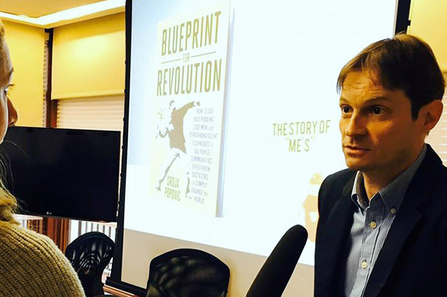 Ако би се за Срђу Поповића могло ишта објективно рећи, то је да је он неуморни самопромотер. Ово је, наравно, намењено као комплимент јер би га у противном назвали, рецимо, опортунистом. Зато можда он сам индиретно сугерише одговор на горња питања у осмом поглављу своје књиге, где оком професионалца подвргава критици погрешне потезе недавно угушеног покрета „Occupy“ (Окупирај) у САД, што је резултирало његовим неуспехом, и дели савете како би се почињене грешке могле поправити. Са техничког становишта савети јесу квалитетни. Али зашто би се специјалиста за смењивање режима сматраних непријатељима САД бавио исправљањем грешака неког масовног протестног покрета у САД, осим ако није наумио да смени режим у Вашингтону? У том случају, зар би га подржавао и промовисао неки део, макар периферни, америчког Естаблишмента? Ово је врло парадоксална ситуација.