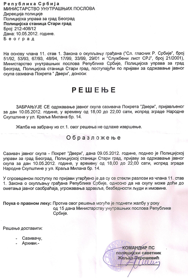 У решењу стоји да „на скупу може доћи до ометања саобраћаја, угрожавања здравља, безбедности људи и имовине”, што се никада у 13 година дугој историји Двери није десило ни на једном нашем скупу и што представља само бедан изговор за забрану. Ради се о нечему управо супротном: Тадићев режим угрожава здравље, безбедност и имовину свих грађана Србије, а изборном крађом покушава да задржи власт и Двери му то неће дозволити. Наша борба против изборне крађе се наставља.