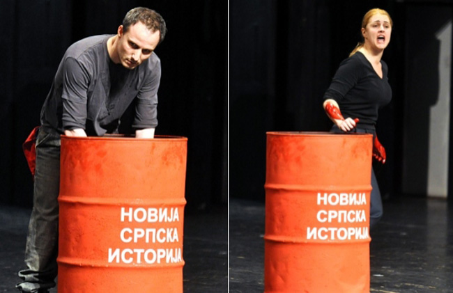 Зашто превише бринемо о тој представи? Она ће вероватно као дело врхунске уметничке вредности бит приказана на водећим аристократским сценама у Лондону, Паризу, Мадриду, Риму, Берлину... да мало и те културне империје са хиљадугодишњом традицијом просветлимо овим делом наших позоришних великана. Нека се Европљани диве црвеном бурету пуном црвене боје, на коме пише „новија српска историја“, у које глумци умачу руке и ваде их крваве. Фрљнућемо то Европи.