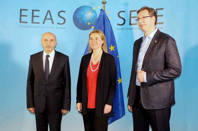 После састанка с Вучићем, Федерика Могерини разговарала је с косовским премијером Исом Мустафом који предводи делегацију Приштине у преговорима с Београдом.