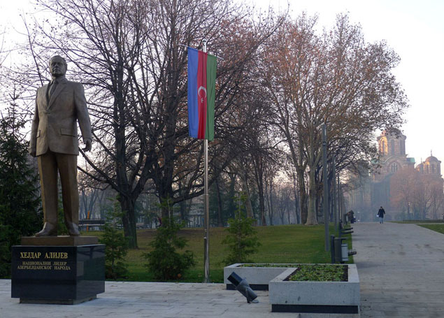 Дивно је, пре пола године, реконструисан ташмајдански парк. У њему је постављен монументални споменик од бронзе. На постаменту од црног мермера пише: „Хејдар Алијев, национални лидер Азербејџана“. Церемонија отварања споменика је уприличена званичној посети Београду председника Азербејџана, Илхама Алијева. Посебан „шарм“ тој свечаности је дао Њ.Е. Елдар Хасанов, резиденцијални амбасадор Азербејџана у Србији, а нерезиденцијални у Црној Гори. Када државни протокол све дигне на највиши ниво, у знак те посете се премешта целокупни београдски живот.