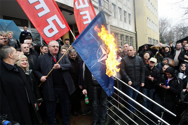 Шешељ је данас испред Вишег суда у Београду запалио заставе ЕУ и NATO.