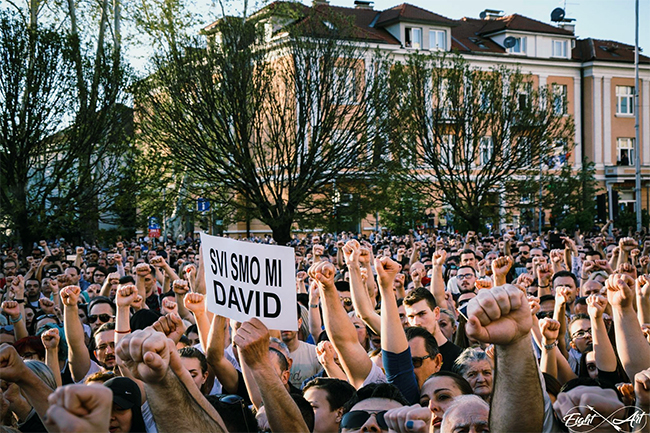- Зато у најмању руку треба дићи обрву над чињеницом да се стотине и хиљаде грађана који се окупљају на бањалучком Тргу Крајине свакодневно сликају са подигнутим песницама, док истовремено у Фејсбук групи „Правда за Давида”, која броји више од 250 000 чланова, корисници на дневном нивоу остављају хиљаде коментара са мини-анимацијом стегнуте песнице