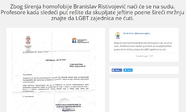 - Пред Вишим судом у Новом Саду Бранкица јанковић, повереник за заштиту равноправности, поднела је тужбу против професора Правног факултета Бранислава Ристивојевића. Тужба се односи на његов изванредан чланак објављен у лето прошле године на порталу НСПМ-а. Текст је само врло прецизно указао на све потенцијалне проблеме које би тадашњи предлог закона о превенцији насиља у породици могао да направи. Побогу, људи, како се зове политички систем у коме је то могуће?