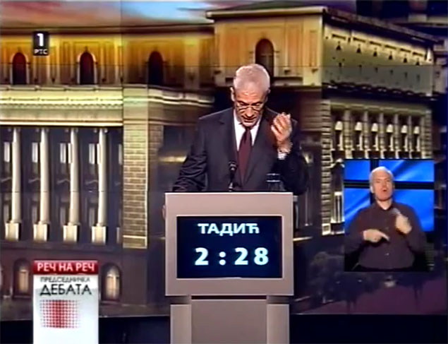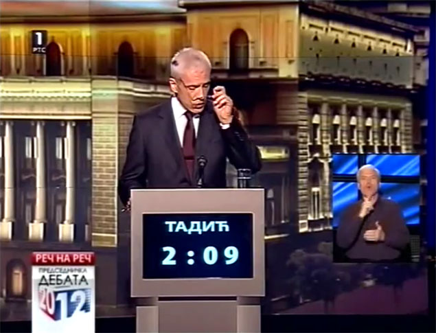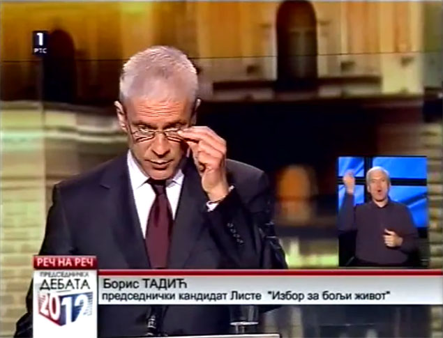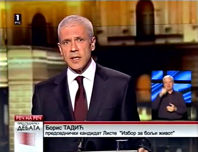 ТАДИЋ: Добро, пре свега, поштовани грађани, ово је један важан дан за Србију, јер се на неки начин одлучује о томе ко ће 20. маја добити поверење грађана и којим путем ће земља ићи даље. Ја сам се увек борио за политику, за борбу мишљења и борбу идеја, а не за борбу људи. Јер, борба људи је за гладијаторске арене, а не за једну цивилизовану дискусију у којој свакако нема места оптужбама које су потпуно неутемељене.