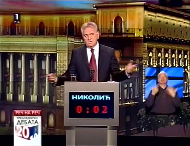 НИКОЛИЋ: Па, ја сам заиста мислио да ћемо да говоримо макар о садашњости, а у великој мери о будућности. Господин Тадић живи у прошлости! Он се враћа у време када је правио лутке, а Србија ишла својим путем. Али, хтео бих да се захвалим господину Коштуници на подршци коју ми је дао за изборе у другом кругу и да подсетим господина Тадића да ће он склопити владу са Чедомиром Јовановићем који се залаже за независнот КиМ и који тврди да је Република Српска геноцидна творевина.
