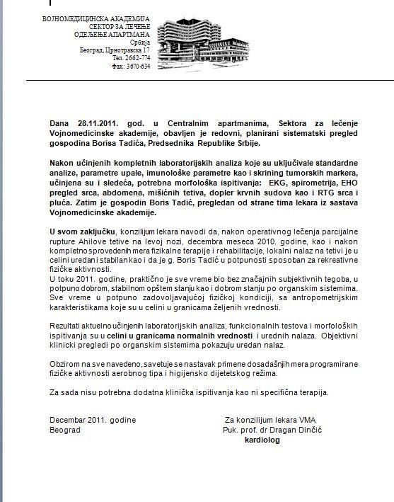 - Међутим, Тадић није тада новинарима рекао истину. Извори из најугледније српске медицинске установе, Војномедицинске академије, увјеравају нас да је Тадићево здравље јако нарушено - толико да се чуде како уопће функционира