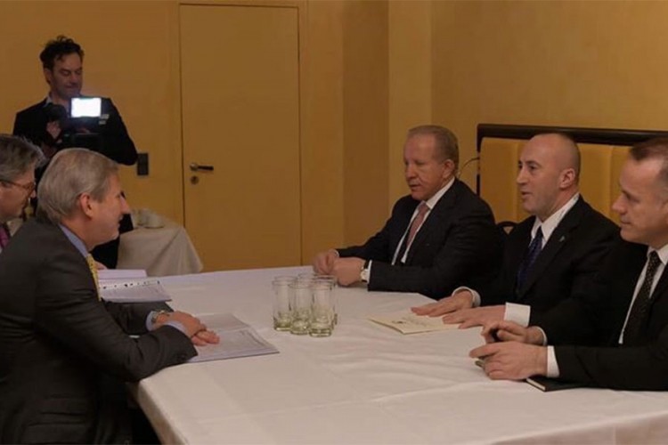 ПРЕМИЈЕР шиптарског Косова, Рамуш Харадинај, састао се данас у Минхену са комесаром Европске уније за проширење и суседске односе Јоханесом Ханом којем је поновио да ће таксе која су уведене на робу из Србије и Босне и Херцеговине бити укинуте када Србија призна Косово.